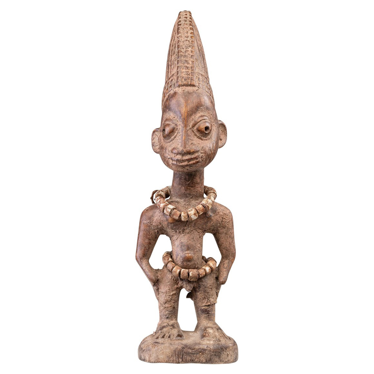 Diese männliche Ibeji-Figur ist eine Holzskulptur des Yoruba-Stammes in Nigeria. Sie misst 7x8x28 cm und stammt aus dem 20. Jahrhundert. Diese Ibeji-Figur ist ein wunderschönes und eindrucksvolles Objekt, das die reiche Kultur und Traditionen des Yoruba-Stammes widerspiegelt. Es ist ein Zeugnis der Handwerkskunst und des Talents der Yoruba-Bildhauer. Die Figur ist aus Naturholz geschnitzt, was ihr ein rustikales und authentisches Aussehen verleiht. Das Holz hat eine leicht raue Textur, die ihm ein angenehmes Tastgefühl verleiht.