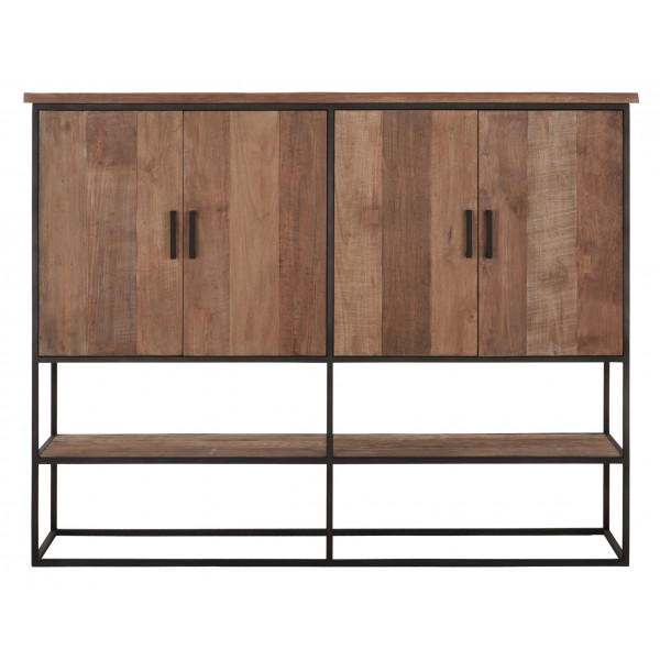 Der breite Schrank Beam besteht aus recyceltem Teakholz und einer Metallstruktur. Er misst 180x40x140 cm, verfügt über 4 Türen und ein offenes Regal.