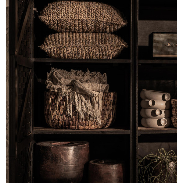 Die Karma-Garderobe ist ein wunderschönes Möbelstück, das verschiedene handwerkliche Techniken kombiniert. Es wurde aus wiederverwertetem Holz handgefertigt und verfügt über einen Eisenrahmen und eine langlebige, handgewebte Rattantür mit einer schwarzen, matten Oberfläche. Die Regale eignen sich perfekt, um Ihre Lieblingsschätze zu präsentieren, der Rest lässt sich problemlos hinter der wunderschön strukturierten Tür verstauen. Dieses Möbelstück ist sowohl praktisch als auch ästhetisch und eine stilvolle Ergänzung für jeden Raum in Ihrem Zuhause.