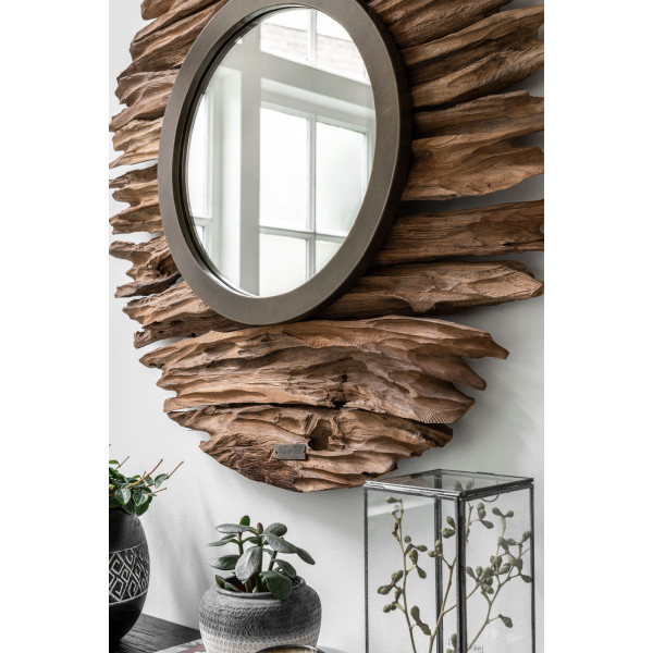 Der Spiegel Pure der Marke MUST Living hat einen Durchmesser von 85 cm und eine Dicke von 7 cm. Jeder Pure Spiegel ist aufgrund seiner Herstellung aus Teakholz einzigartig, mit echten Stücken, die die Authentizität dieser Kreation unterstreichen.