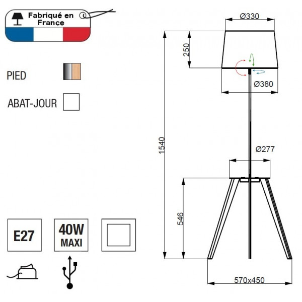 Diese asymmetrische Stehlampe Trio besticht durch ihr Design und die Kombination der verwendeten Materialien. Sehr praktisch, sie vereint mehrere Funktionen: Leuchte, Ablage und Smartphone-Ladegerät. Sie ist ideal für ein Wohnzimmer, ein Wartezimmer oder eine Empfangshalle! Die Stehlampe verfügt über eine Metallablage mit 2 USB-Anschlüssen, einen Fuß aus natur lackiertem Buchenholz, eine E27-Fassung (Glühbirne nicht im Lieferumfang enthalten) und einen Schirm aus kaschiertem Baumwollstoff.