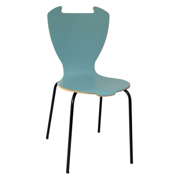 Der energiegeladene Designstuhl ist blau/grün. In der oberen Rückenlehne befindet sich eine Lücke und umgekehrt eine „Zunge“ an der Sitzkante. Es ist für ein Designer-Interieur geeignet. Das mattierte Finish Furnier und die geölten Kanten, seine Struktur ist aus massiver Buche, die Beine aus schwarz und matt lackiertem Metall. Seine Abmessung beträgt 79x42x41 cm, seine Sitzhöhe beträgt 43,5 cm und seine Tiefe beträgt 35 cm. Die Produktion ist ökologisch und respektiert die Erhaltung der Umwelt.