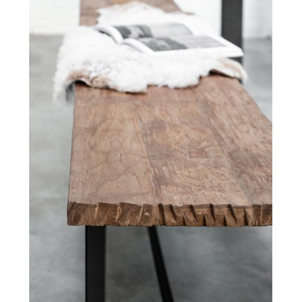 Bænken Beam er lavet af genanvendt teaktræ og har en struktur i sort metal. Bænken findes i flere størrelser og to farver: brun og sortfarvet. Bordpladen er 3 cm tyk.