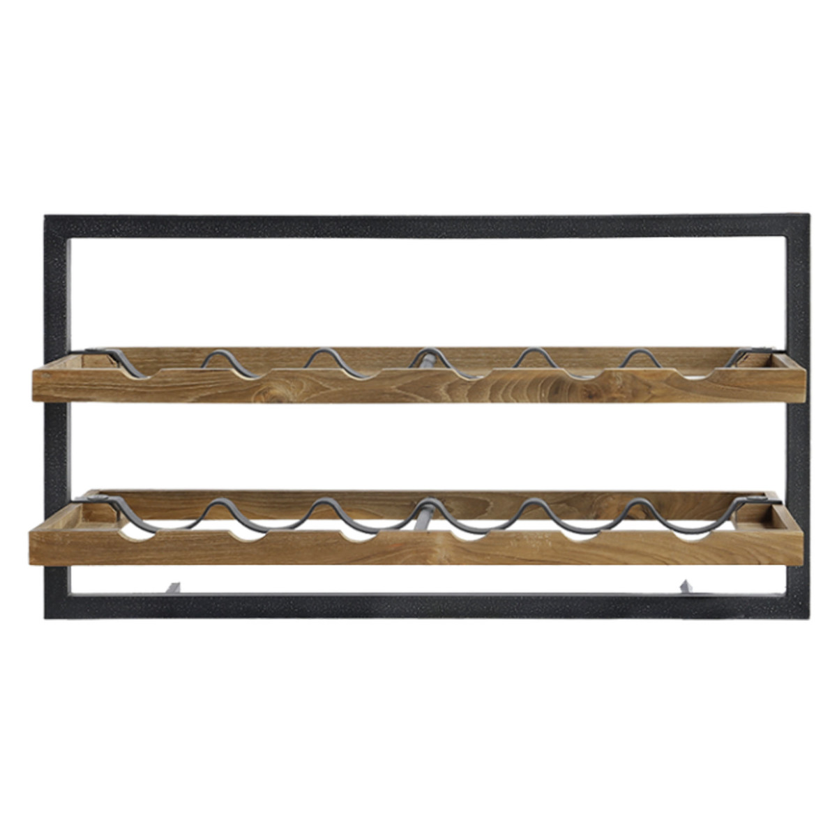 Denne type A 12-flaske vinstativ er et vinstativ designet til at harmonisere perfekt med vores hylder. Praktisk og elegant, det giver dig mulighed for at fremhæve dine yndlingsflasker vin på en sjov måde. Dette vægmonterede vinstativ er håndlavet af genvundet teak og håndloddet jern. Du kan hænge det alene eller kombinere det med andre Shelfmates flaskeholdere eller hylder. Type A kan rumme op til 12 flasker vin. Dens dimensioner er 65x25,5x35 cm.
