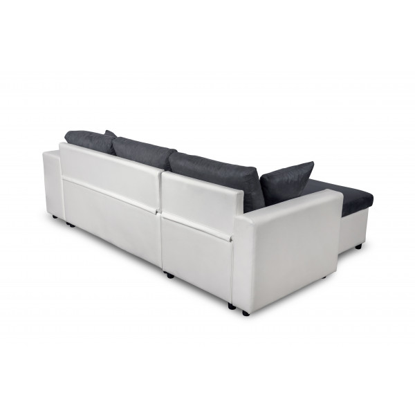 Med sit rene og tidløse design vil denne store hjørnesofa nemt passe ind i enhver indretningsstil. Dens funktioner er mange: stor opbevaringskiste, udtræksseng, vendbar chaiselong, der gør det muligt at modulere din sofa og stue efter dine ønsker, samt en ikke-vendbar (fast) niche, der fungerer som en bred armlæn og giver plads til 2 puffer for at tilbyde 2 ekstra siddepladser. Det er den ideelle sofa til at modtage venner og familie! Dens forskellige varianter af betræk og farver giver dig mulighed for præcist at vælge den stil, der passer til dit interiør. To små tone-i-tone puder medfølger for ekstra komfort.