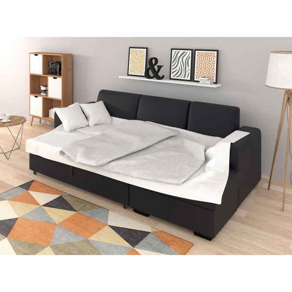 De grå versioner har et stofbetræk. Den sorte version er i PU kunstlæder. Sofaen måler 262 x 157 x 83 cm med en siddehøjde på 44 cm og en densitet på 28 kg/m³. Soveområdet måler 130 x 210 cm og består af zig-zag fjedre.