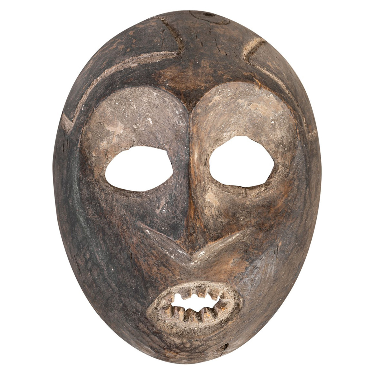 Denne vare er en Ndaaka-maske fra Ituri-stammen i Den Demokratiske Republik Congo. Denne maske, der stammer fra midten af det 20. århundrede, har dimensioner på 29x15,5x37 cm. Maskedesignet er kendetegnet ved en oval form med mørke geometriske mønstre, der står i kontrast til træets naturlige baggrund. Øjnene er skåret i form af en oval, hvilket tillader bærerens synlighed, mens munden er repræsenteret af en rektangulær åbning, der afslører skulpturelle tænder. Maskens overflade har en patina, der vidner om dens alder og brug, hvilket giver den et autentisk og historisk udseende. Det er et stykke, der ikke kun afspejler kunsten fra Ituri-stammen, men også deres kulturelle og ceremonielle traditioner.