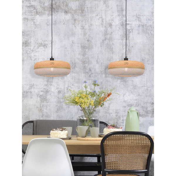 Palawan vedhæng lampen kombinerer jern og bambus, tilføjer et eksotisk touch til en indretning. Denne armatur skaber et spil af skygge og delikat lys for at gøre en stue eller køkken endnu mere brugervenlig. Det er kendetegnet ved en længde på 40-60 cm, en højde på 15 til 200 cm samt en basisstørrelse på 11 cm i diameter og 4 cm tyk. Denne armatur har en E27 base (pære medfølger ikke).