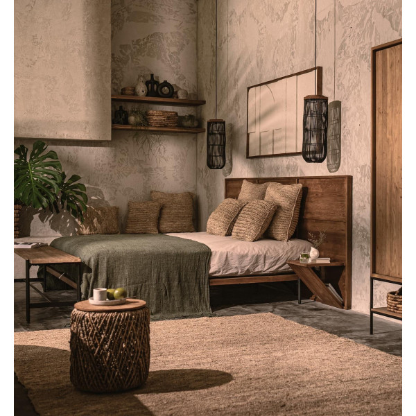 Outline seng med natbord er et enestående produkt, fremstillet udelukkende i hånden af genvundet teaktræ. Dens imponerende hovedgærde, dets krop og natborde vidner om uforligneligt håndværk. De slanke jernben tilføjer et strejf af elegance til helheden, samtidig med at de skaber en perfekt balance med det moderne design. Fås i forskellige størrelser, denne seng er et kvalitetsvalg til et unikt og elegant soveværelse.