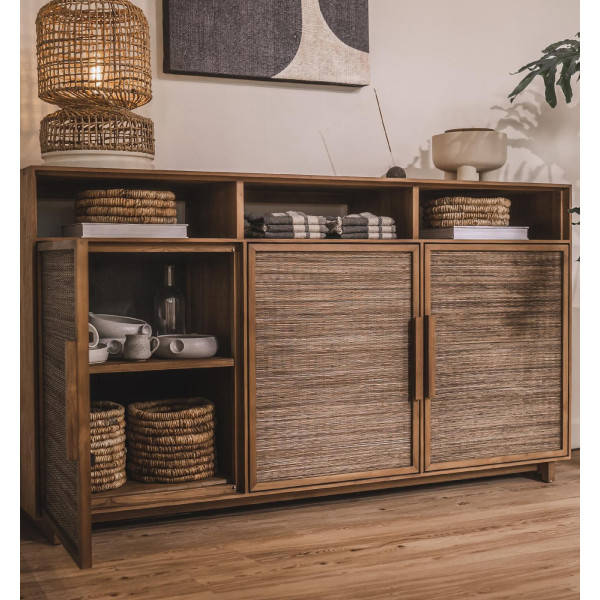 Hopper skænk med 3 døre er en elegant opbevaringsenhed, der bringer et strejf af raffinement til ethvert rum. Håndlavet, den har tre åbne hylder øverst, aftagelige indvendige hylder, og indrammede teakdøre med smigrende teakhåndtag. Dørfladerne er dækket med håndvævede kokosblader for en unik effekt. Med sine dimensioner på 170x45x95 cm er det et ægte dekorativt objekt, der passer perfekt ind i et