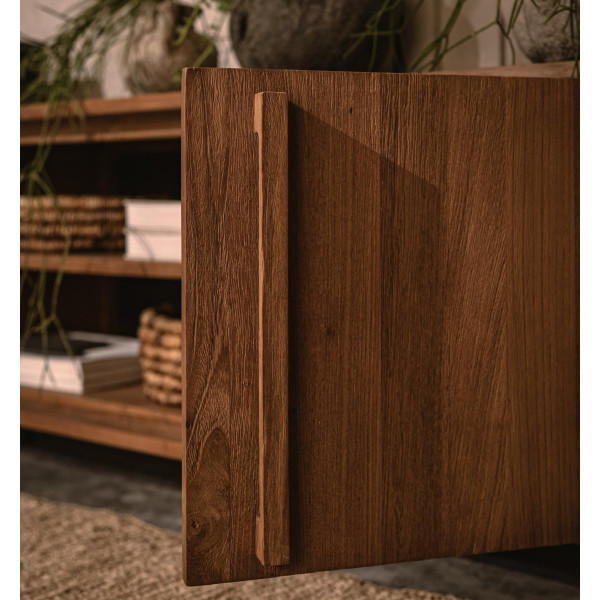 Outline skænk er et alsidigt møbel, der kan bruges som skænk eller som tv-stativ. Dens slanke silhuet passer nemt ind i ethvert rum. Lavet af genvundet teaktræ af meget høj kvalitet og suppleret med jernben, dette møbel har både lukkede rum og åbne hylder, der tilbyder adskillige opbevarings- og visningsmuligheder. Dens dimensioner er 171x42,5x55
