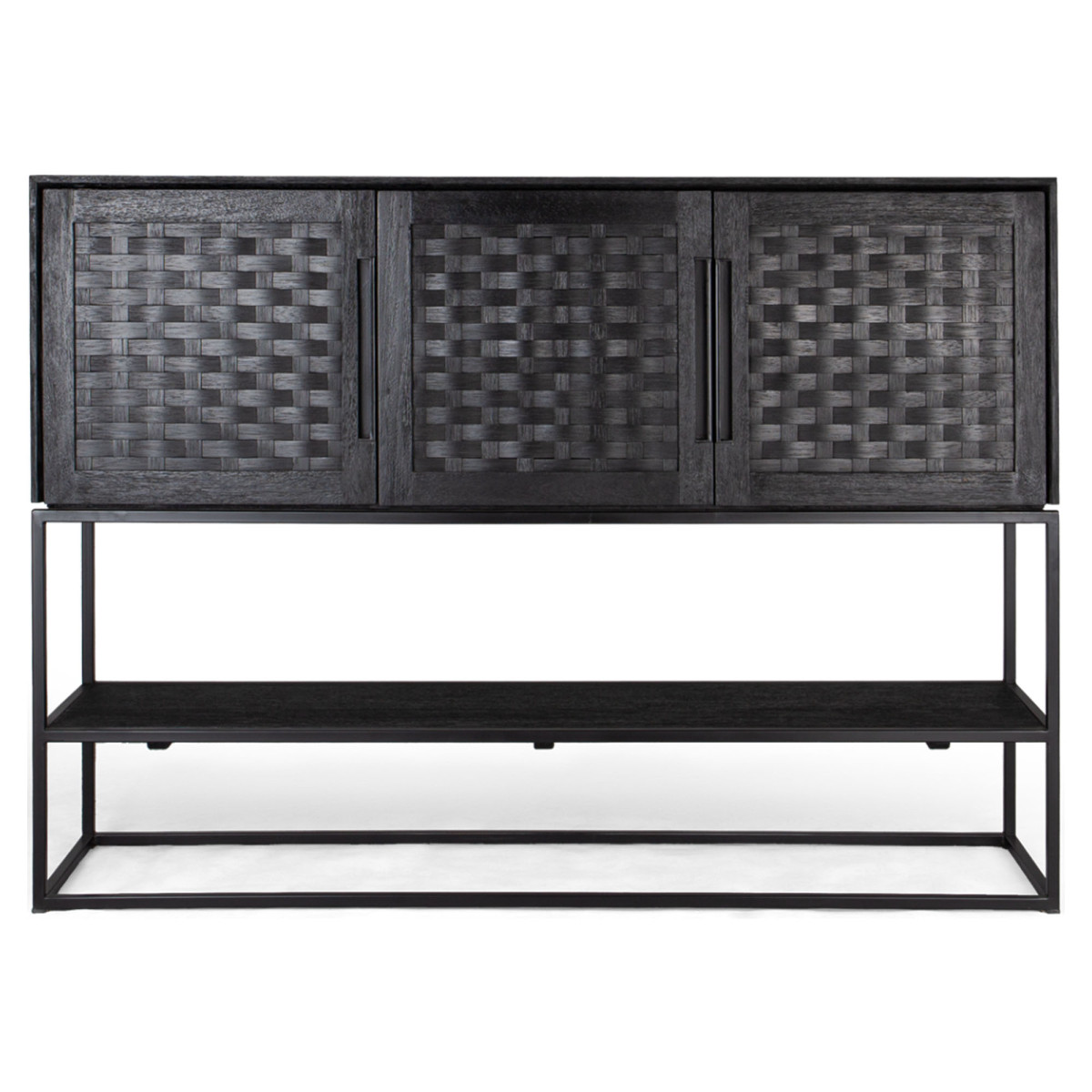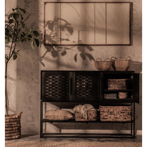 Denne Karma skænk med 3 døre og 1 hylde er et elegant og økologisk møbel, håndlavet af genvundet træ. Den har tre håndvævede rottingdøre, behandlet med en miljøvenlig sort mat finish og en robust jernramme. Det åbne rack er perfekt til fremvisning af dine yndlingsskatte, mens resten let kan opbevares bag de smukt strukturerede døre. Med en størrelse på 155x40x110 cm er denne kommode ideel til at tilføje stil og organisation til dit hjem.