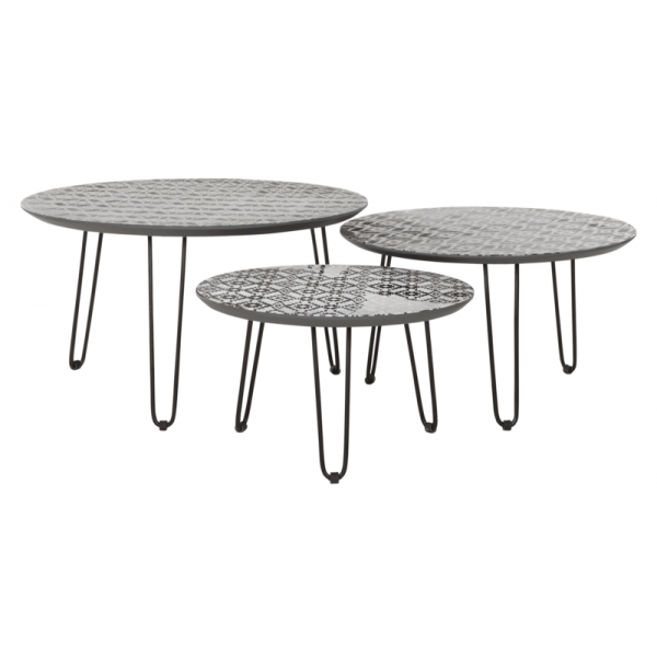 Mønstret på sofabordet MUST Living Sumba er inspireret af de indfødte klæder, der findes på den indonesiske ø Sumba. Bordet findes i tre størrelser. Benene er lavet af sort metal, og bordpladen er af harpiks.