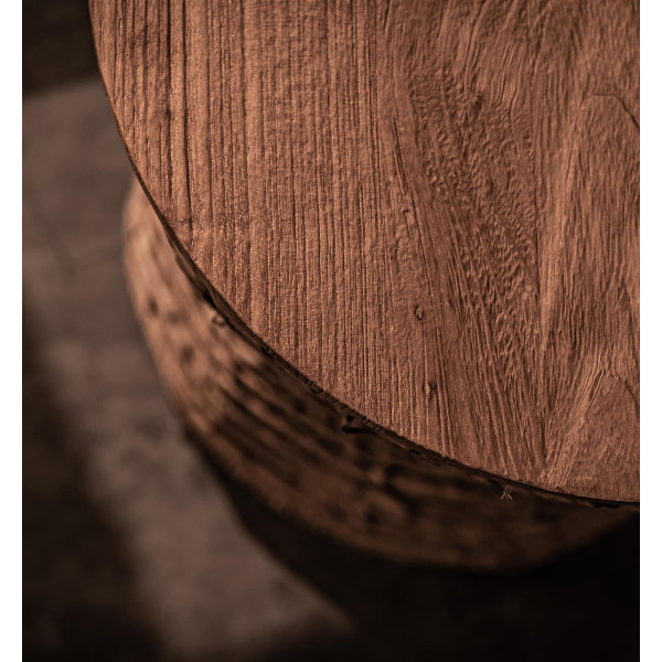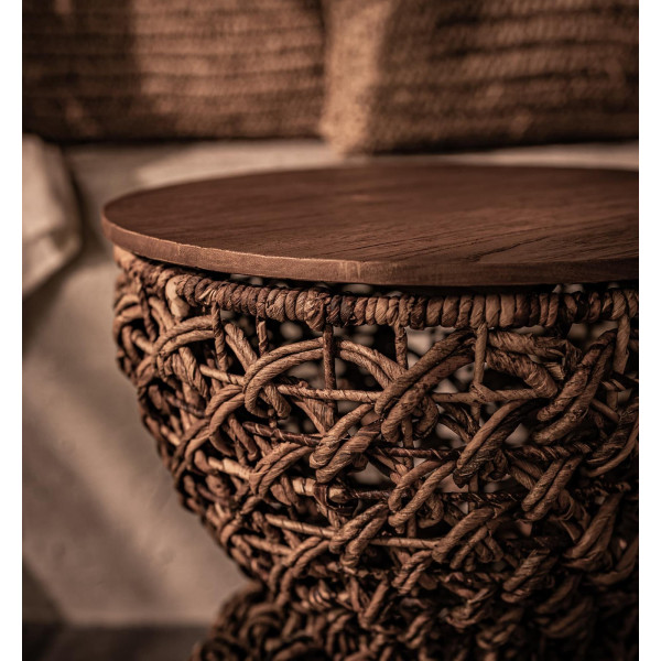 Rebana Sopran er en alsidig tromleformet afføring, der kan bruges som sæde, sofabord eller til dekoration, afhængigt af præference. Dens overflade er lavet af genvundet teaktræ af høj kvalitet, og rammen er lavet af massiv tråd, helt indpakket i organisk abaca reb, håndlavet ved hjælp af gammel javanesisk teknik. Med dimensioner på 40 x 40 x 46,5 cm er denne skammel perfekt til at tilføje et rustikt og eksotisk touch