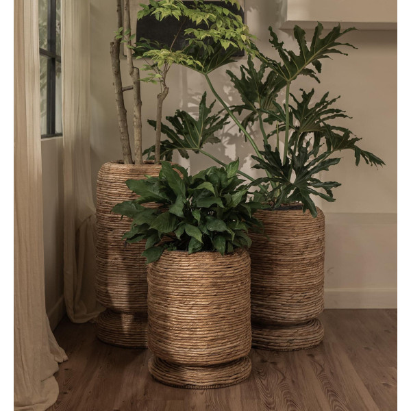 Den kegledækkede gryde fås i 3 størrelser. Cone er en stilfuld og funktionel planter designet til at tilføje et strejf af grønt til interiøret. Det er sammensat af jern dækket med fletning af abaca bark. Det er lavet af bæredygtige materialer, hvilket gør det til et miljøvenligt valg.