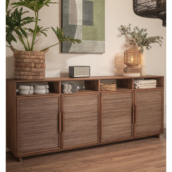 Nelja uksega Hopper puhvetkapp on elegantne ja diskreetne mööbliese, mis toob igasse ruumi viimistlustunde. See suur kummut on käsitsi valmistatud ja on 4 avatud riiulid ja eemaldatav sisemine riiulid. Uksed on raamitud teak nutikalt süvistatud servad ja meelitav teak käepidemed. Ukse näod on kaetud käsitsi kootud kookoslehtedega. See mööbliese on soovitav kalliskivi igas kaasaegses või klassikalises ruumis. Selle mõõtmed on 226x45x95 cm.