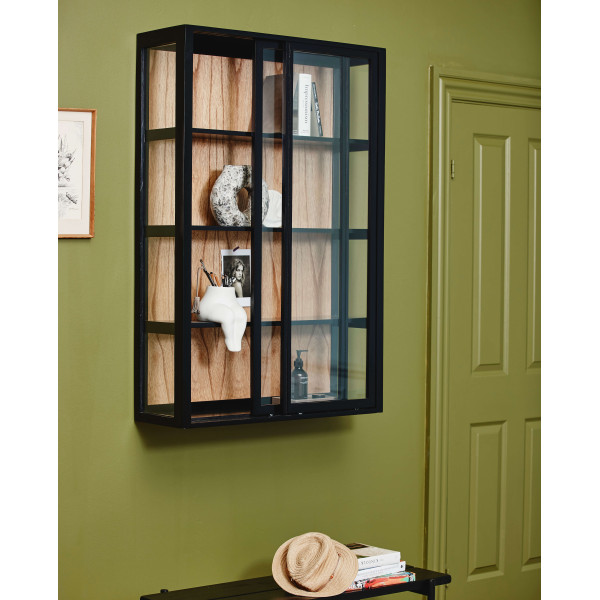 Selle nelja MDF-riiuliga ja kahe klaasuksega on see seinakapp praktiline erinevate tarvikute hoidmiseks. Selle must mahagon puitkonstruktsioon ja vineer tagavad selle stabiilsuse ja töökindluse. Selle riidekapi pikkus on 26x82x122,4 cm.