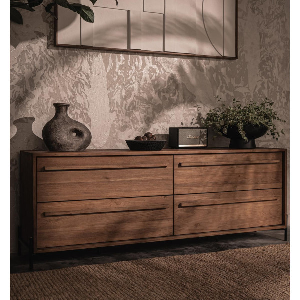 See kontuuri kummut on suurepärane näide kaasaegsest mööblist. Oma puhta silueti ja muljetavaldava puidutööga sobib see hõlpsasti igasuguse interjööri stiiliga. Varustatud nelja avarat sahtlit, see seade pakub palju ruumi. Käsitsi valmistatud taastatud tiikpuust ja seda toetavad rauast jalad, see on nii vastupidav kui ka elegantne. Mõõtmetega 194x42,5x70 cm, see ülevaade kummut on kehtestav mööbliese, mis toob teie kodu kujundusele kaasa keerukuse.
