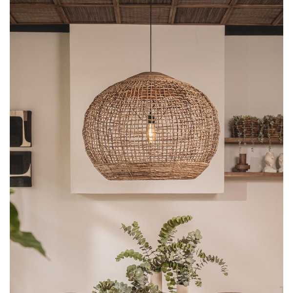 Tumbler Koi ripats on lamp saadaval kolmes erinevas suuruses: S, M ja L. See on valmistatud metallkonstruktsioonist kuju palli avatud allosas, oskuslikult kaetud abaca koor luua maamees ja meeldiv kootud ilme. Lambivari ülaosa on kaunistatud käsitsi pööratud taastatud tiikpuu harjaga. See võistluskalendri on ideaalne valik kõigile, kes soovivad lisada puudutus loomulik võlu oma kodus.