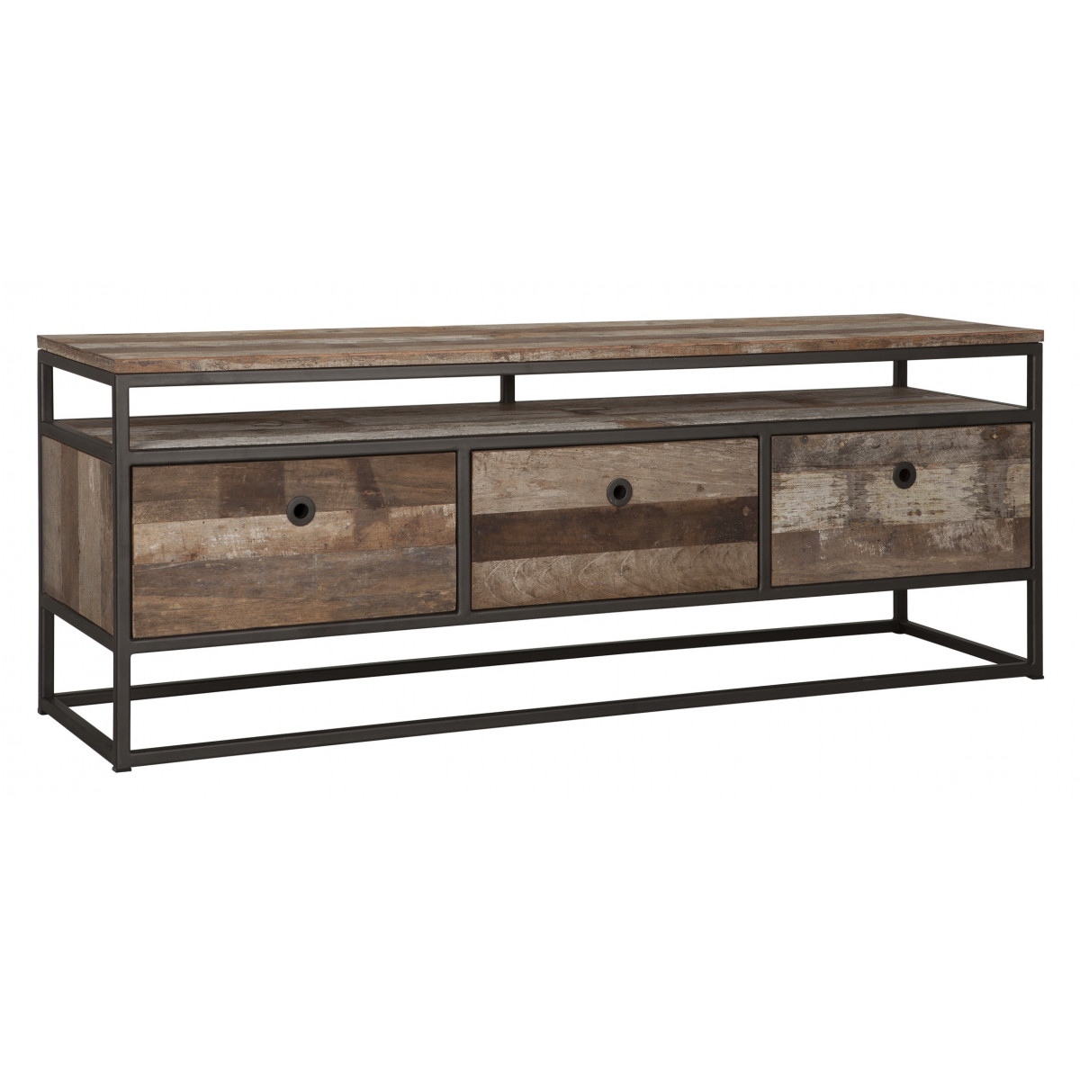 Tuaregi telerikapp on valmistatud taaskasutatud tiikpuust ja sellel on must metallraam. Telerialus on saadaval kahes suuruses ja sellel on kolm sahtlit.