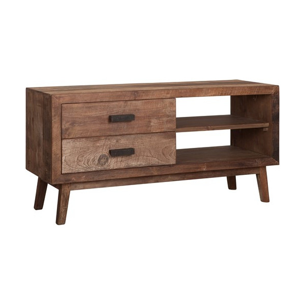 Taaskasutatud tiikpuust telerialus - 2 sahtlit, 2 riiulit