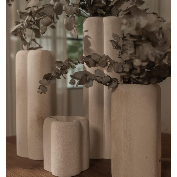 DBodhi kumer vaas on ainulaadne ja kaunilt kujundatud tükk. DBodhi logo kujust inspireerituna loob „ristik”, mis koosneb kolmest põimunud silindrist, elegantse ja silmatorkava vaasi. Java kohalikust liivakivist valmistatud käsitsi valmistatud vaas on õrna veiniga iseloomulik, andes talle individuaalse värvi. See vaas on saadaval neljas suuruses.