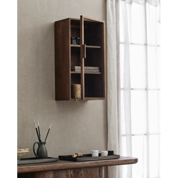 Versátil y práctico, este armario de pared Nango aporta un toque elegante y cálido a la sala de estar. Ofrece un gran espacio de almacenamiento gracias a sus dos estantes de madera maciza de mango. Este armario cuenta con puertas de vidrio con soporte horizontal para colgarlo fácilmente. Existe en dos tamaños según las preferencias.