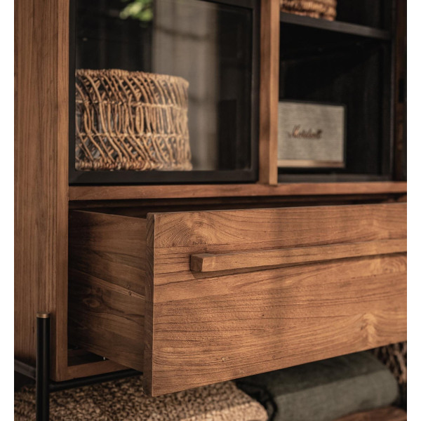 El armario Outline es una elegante unidad de almacenamiento para añadir a tu sala de estar. Con dos puertas de vidrio, un cajón y un estante abierto, este armario alto ofrece mucho espacio para todo, desde platos hasta libros y todo lo demás. Hecha a mano con madera de teca, vidrio y hierro recuperados, esta pieza versátil combina perfectamente con cualquier estilo de interior. Con unas medidas de 94 x 42,5 x 195 cm, este mueble es perfecto para quienes buscan añadir un toque de estilo y funcionalidad a
