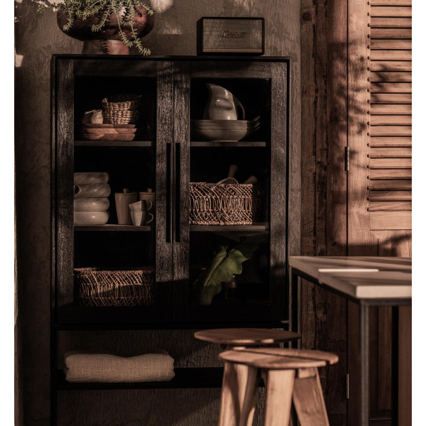El armario Karma con 2 puertas de vidrio y 1 estante es un producto hecho a mano con madera recuperada y hierro. Este armario alto está equipado con dos puertas de vidrio y un estante abierto, lo que lo convierte en la opción ideal para exhibir tus vajillas, jarrones u otros accesorios decorativos favoritos y, al mismo tiempo, es un elemento decorativo por derecho propio. Con un tamaño de 95x45x165 cm, este mueble es perfecto para espacios amplios e interiores modernos. Está diseñado con técnicas artesanales variadas para garantizar su calidad y durabilidad. Este mueble de 2 piezas es una opción elegante y duradera para tu hogar.