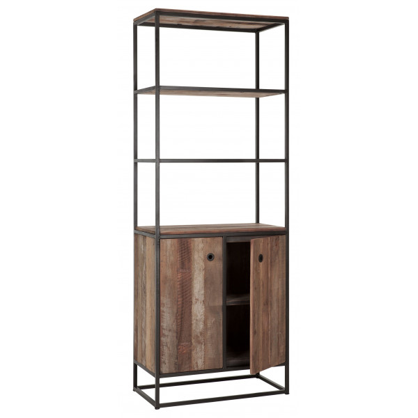 La biblioteca Touareg está compuesta de madera de teca reciclada y tiene una estructura de metal negro. La biblioteca mide 75x40x200 cm y tiene 2 puertas y 3 estantes abiertos.