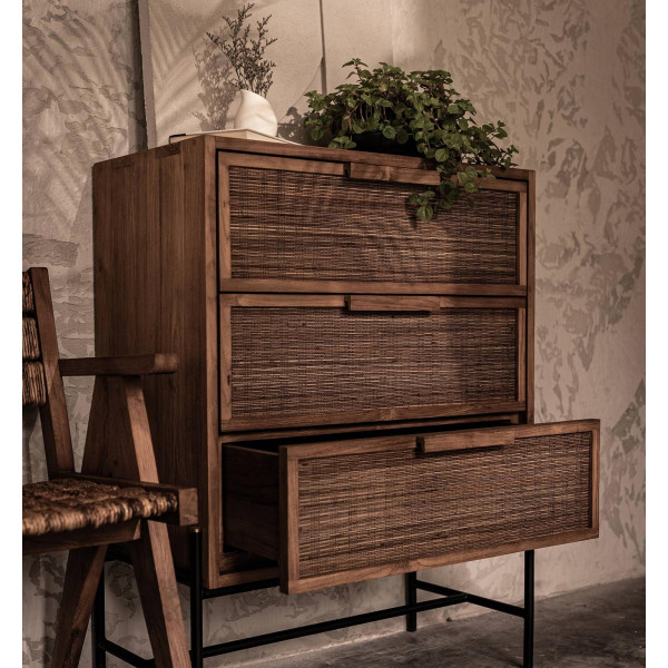 Esta cómoda Coco con 3 cajones es un mueble hecho de madera de teca recuperada, hierro y tejido a mano a partir de las venas de las hojas de coco. Esta auténtica pieza de artesanía llama la atención de inmediato. La cómoda tiene tres cajones espaciosos para guardarla fácilmente. Un ligero ángulo en el marco de madera contribuye a su aspecto único. Su tamaño es de 79,5x40x100 cm.