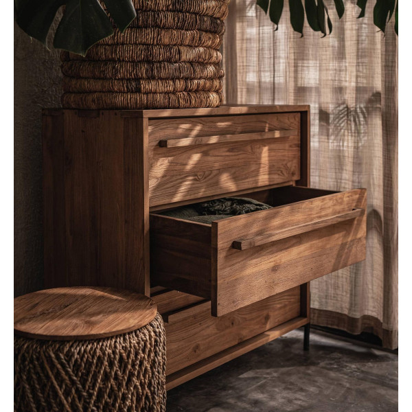 Esta cómoda Outline con tres cajones es una cómoda moderna con un diseño limpio y sencillo que combina fácilmente con cualquier estilo interior. Esta cómoda está hecha a mano con madera de teca recuperada y tiene patas de hierro con un diseño minimalista. Está equipado con tres cajones espaciosos para satisfacer todas tus necesidades de almacenamiento. Sus dimensiones son 84x42.5x85 cm.