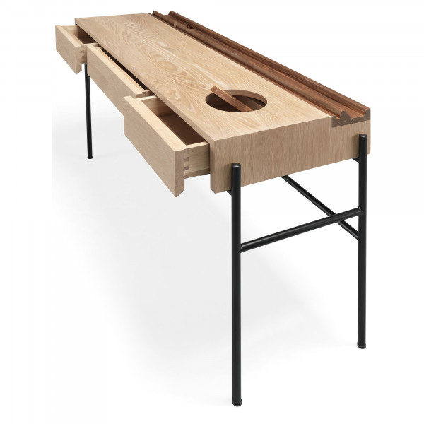 La consola minimalista Concierge está fabricada en roble macizo con algunos elementos en nogal. Es una combinación perfecta de madera y