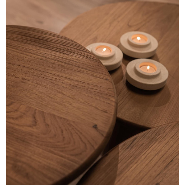 El juego de tres mesas de café Dino es un gran artículo para cualquier espacio interior. Equipadas con tapas sofisticadas y prácticas con bordes curvos y con cámaras, estas mesas de teca recuperada están diseñadas con gran artesanía: sus bases robustas están hechas de patas tipo pedestal. Un tratamiento de acabado superficial mínimo les da un encanto rústico y «vivido» único. Las mesas miden 80x80x40 cm, 60x60x35 cm y 40x35x45 cm.