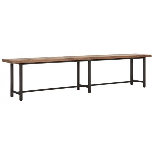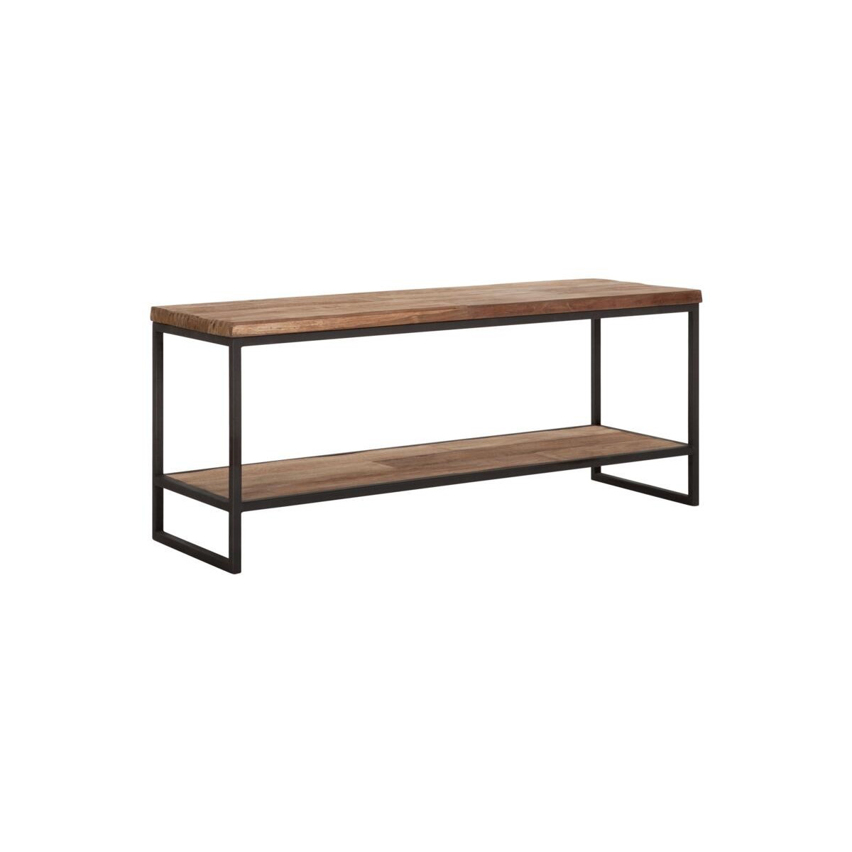 El mueble de TV Beam está fabricado en madera de teca reciclada y tiene un marco de metal. El soporte está disponible en dos colores (marrón y tintado en negro), tres tamaños y la parte superior tiene un grosor de 3 cm.