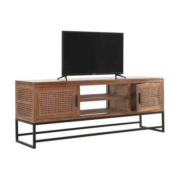 Este soporte de TV Tribute es perfecto para la sala de estar. Está hecha de ratán, madera de mindi y correa en colores suaves y naturales. Su base es de metal negro. Además, ofrece el máximo almacenamiento gracias a sus dimensiones de 150x40x55 cm. El soporte para TV consta de dos puertas y dos estantes abiertos.