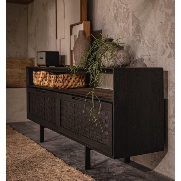 Este soporte de TV Karma con 2 cajones y 1 estante abierto es un precioso mueble de nuestra colección Karma. Esta unidad de dos cajones está hecha a mano con madera recuperada y tiene patas de hierro y cajones de ratán tejidos a mano con una hermosa estructura. La divertida posición de sus pies añade un toque más vintage de mediados de siglo al diseño. Este mueble es la elección perfecta para quienes buscan añadir un toque de encanto y elegancia a su hogar.