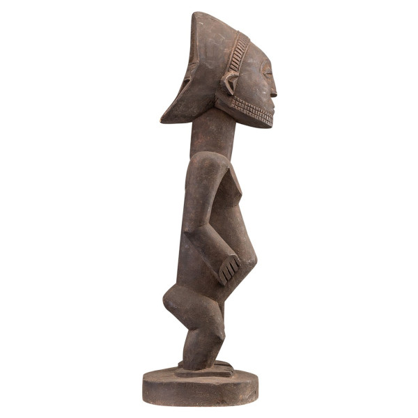 Esta representación icónica de un antepasado hemba, que data del siglo XX y originario de la República Democrática del Congo, adopta una postura clásica, con las manos apoyadas en el ombligo y los ojos medio cerrados. Lleva la impronta de la nobleza ancestral y fortalece los lazos familiares durante ceremonias cruciales. Como receptáculo espiritual, facilita la conexión entre los mundos de los muertos y los vivos. Tallada en madera natural, esta pieza única de 30 x 25 x 87 cm encarna con elegancia la herencia artística y espiritual de la tribu hemba, adquiriendo un significado profundo y una