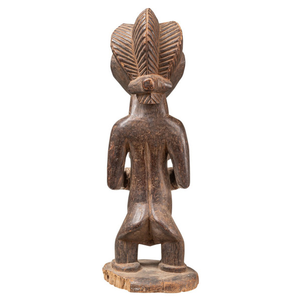 Esta figura ancestral femenina hemba, que data del siglo XX y es originaria de la República Democrática del Congo, encarna la tradición con las manos colocadas en el ombligo y los ojos entreabiertos. Responsable de la nobleza de los antepasados, simboliza el poder espiritual y fortalece el linaje familiar durante las ceremonias esenciales. Las hermosas escarificaciones del abdomen añaden una importante dimensión artística a esta pieza única de madera natural de 18,5 x 20 x 57,5 cm. Como contenedor espiritual, facilita la conexión entre los mundos de los muertos y los vivos, lo que demuestra el profundo patrimonio cultural de la tribu hemba en la República Democrática del Congo.
