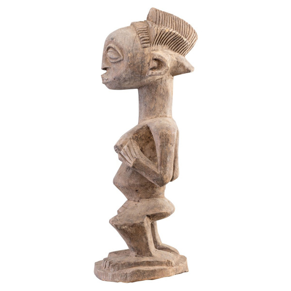 Esta escultura es un modelo único de esculturas de madera de Lega de mediados del siglo XX, originarias de la República Democrática del Congo. La obra mide 32x28,5x77 cm. Representa una figura humana de pie con rasgos exagerados: ojos cerrados, boca prominente y orejas detalladas. La figura tiene los brazos cruzados sobre el pecho y se coloca sobre una base circular decorada con motivos incisos. La escultura presenta una pátina uniforme y signos de la edad y