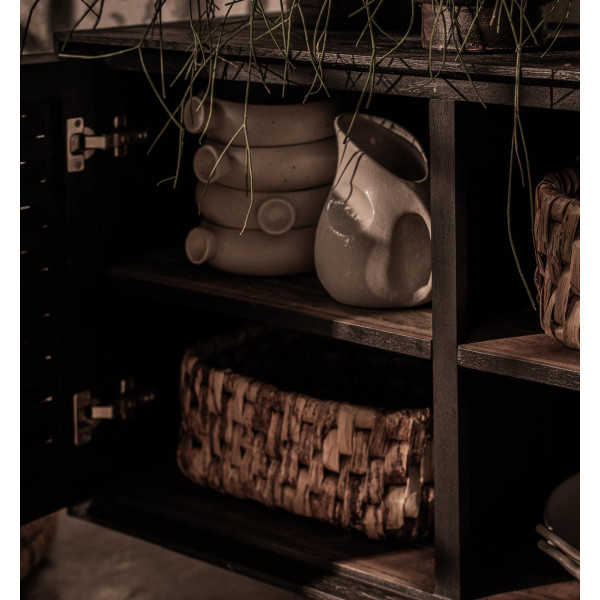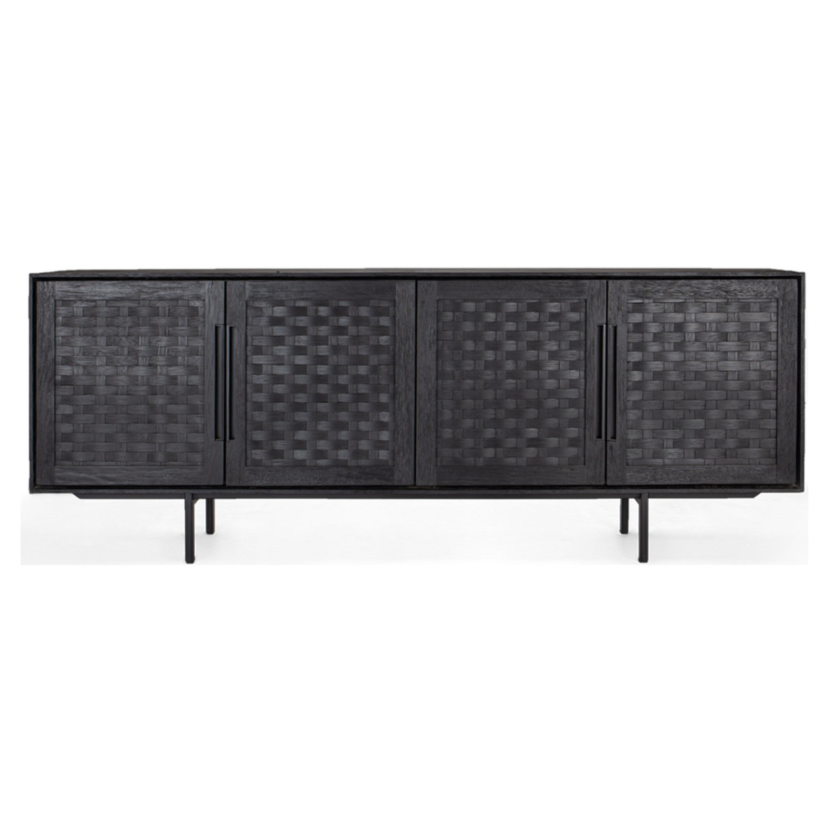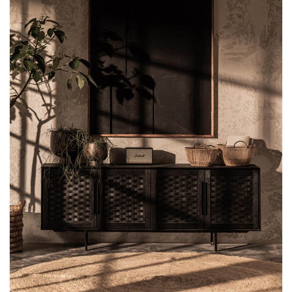 Este aparador Karma con 4 puertas es un precioso mueble de almacenamiento con cuatro puertas, de nuestra colección Karma. Esta cómoda es el resultado de una artesanía excepcional. Está hecho a mano con madera recuperada, con patas de hierro y puertas de ratán bellamente estructuradas y tejidas a mano. La divertida posición de sus pies le da al diseño un toque vintage de mediados de siglo. Con unas dimensiones de 200 x 40 x 75 cm, este mueble es perfecto para guardar tu ropa, libros o cualquier otro objeto de tu elección. Añada un toque de encanto rústico a su sala de estar con este hermoso aparador Karma.