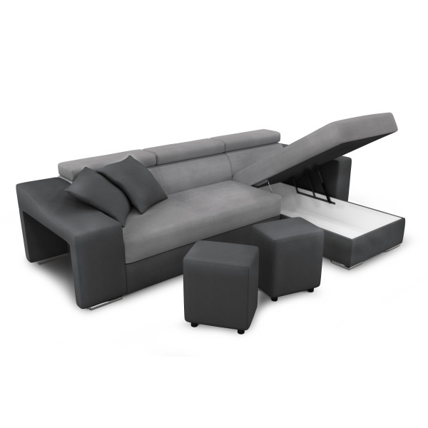 Este gran sofá esquinero reversible Stilo aportará un estilo moderno a tu interior. Ofrece varias funcionalidades como una función de cama para 2 personas, un amplio baúl bajo la chaise longue y reposacabezas ajustables para brindarte el máximo confort. También dispone de un nicho fijo que permite guardar los 2 pufs incluidos para ofrecer 2 asientos adicionales. Se proporcionan dos cojines a juego con el sofá.
