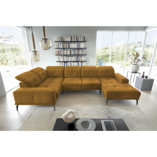 Este sofá esquinero Neviro de la marca Eltap decorará perfectamente el salón y aumentará la comodidad de descansar después de un largo día. Está equipado con un reposacabezas moderno, móvil y ajustable. Está confeccionado en tela de primera calidad con una elegante base de acero negro, lo que garantiza su originalidad en un diseño moderno. Tiene un tamaño real de 350x201x77 cm con una altura de asiento de 44 cm. Está disponible en una amplia gama de colores.