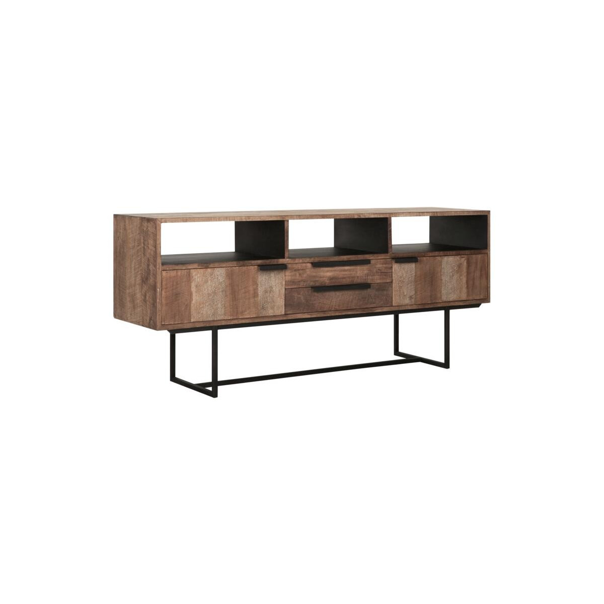 Odeon-senkki on valmistettu tiikkipuusta ja siinä on musta metallirakenne. Senkki on mitoiltaan 175x45x75 cm ja siinä on 3 avointa hyllyä, 2 ovea ja 2 laatikkoa.