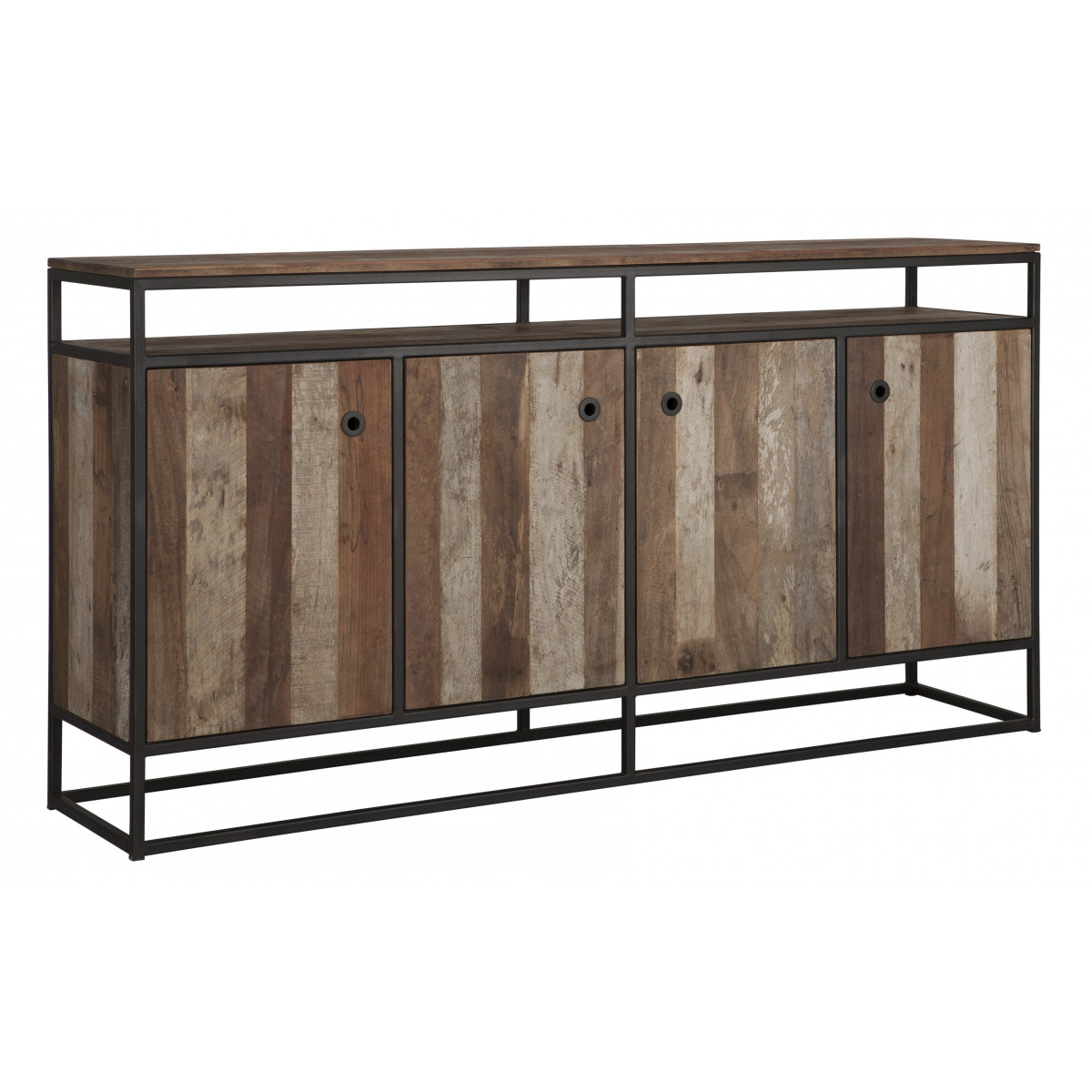 Touareg-senkki on valmistettu kierrätetystä tiikkipuusta ja siinä on musta metallirakenne. Senkin mitat ovat 178x40x90 cm. Siinä on 4 ovea ja avohylly.