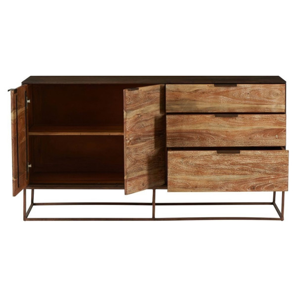 Athezza-tuotemerkin Agra-senkki on täydellinen valinta tyylin ja toiminnallisuuden lisäämiseen sisustukseen. Se koostuu kaapin osasta, jossa on kaksi ovea ja osa, jossa on kolme laatikkoa, mikä tarjoaa käytännöllistä säilytystilaa astioille ja muille raskaille esineille. Sen puurakennetta vahvistaa rautapohja, joka takaa sen laadun ja kestävyyden. Eri materiaalien ja värien yhdistelmä antaa tälle senkille trendikkään tyylin. Teollisella ja maalaismaisella ilmeellä tämä upea säilytysyksikkö sopii helposti kodin sisustukseen. Tämän senkin mitat ovat 150x45x80 cm.