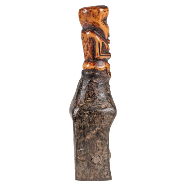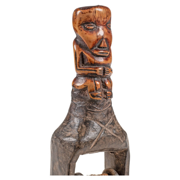 Tämä ainutlaatuinen veistos edustaa kangaspyörää, erityisesti Lega Heddle Pulley -veistosta, Kongon demokraattisen tasavallan Lega-heimosta. Tämä teos on peräisin 1900-luvun puolivälistä, ja sen mitat ovat 5x7x19 cm. Se on valmistettu puusta ja sisältää lankaa. Hihnapyörälle on ominaista tyylitelty muoto, jossa on erottuvat tulosteet ja kuviot, ja siinä on patina, joka osoittaa toistuvan käytön. Tätä käsintehtyä esinettä käytettiin kudontaprosessissa ja se heijastaa Lega-ihmisten taidetta ja kulttuuria.