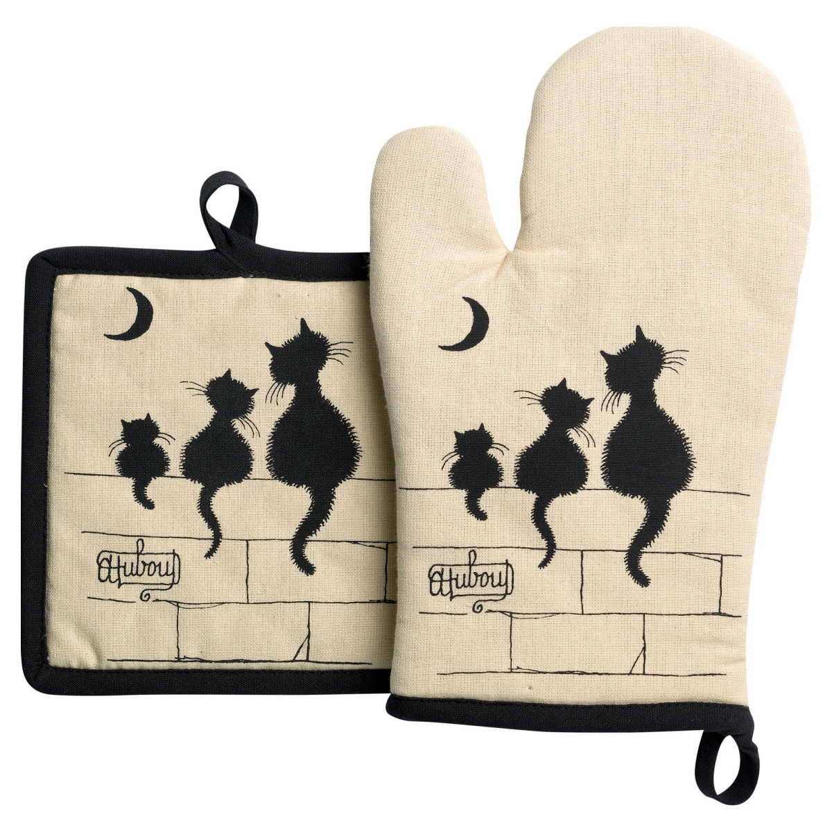 Dubout 3 kissan käsine- ja potholjasetti on keittiö, joka on välttämätön kissan ystäville. Valmistettu 100% puuvillasta, se on pehmeä kosketukseen ja tarjoaa optimaalisen suojan palovammoja vastaan. Sen alkuperäinen ja tyylikäs muotoilu tekee siitä itsessään koriste-esineen. Tämä sarja koostuu käsineestä ja patalangasta, molemmat pehmustettu vaahdolla optimaalisen mukavuuden takaamiseksi. Hansikas on vakiokokoinen ja se on helppo pukea lämpimän ruoan ottamiseen ja kuljettamiseen. Pannunhaltija puolestaan on ihanteellinen kuumien kansien nostamiseen. Ilkikurisella tyylillään ja kirkkailla väreillään Dubout 3 -kissankäsine/kattolappusetti on pakollinen kaikille ruoanlaiton ystäville ja kissoille. Sarjan mitat ovat 18x28 cm