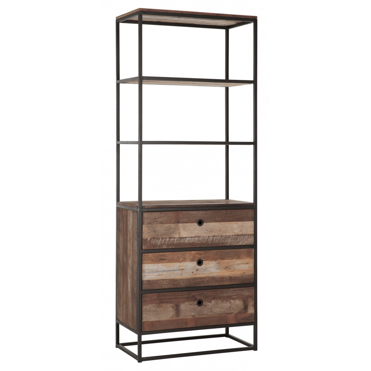 Touareg-kirjahylly on valmistettu kierrätetystä tiikkipuusta ja siinä on musta metallirunko. Kirjahyllyn mitat ovat 75x40x200 cm ja siinä on 3 laatikkoa ja 3 avointa hyllyä.