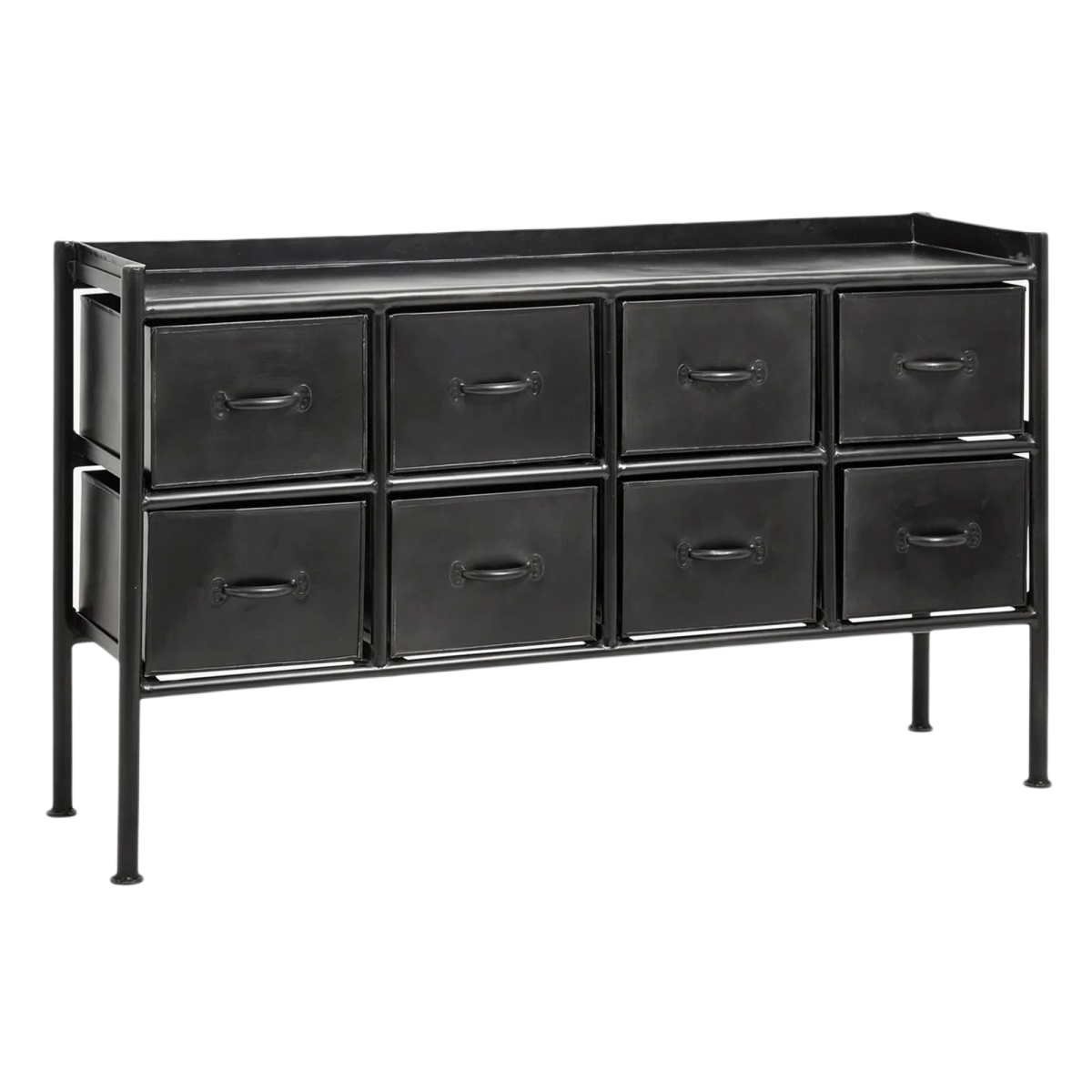 Tämä upea Portland-konsolilaatikko on ihanteellinen maksimaaliseen säilytystilaan, koska siinä on 8 lokeroa. Sen rautarakenne antaa teollisen ja vankan ilmeen. Tämä musta Portland-laatikko mukautuu huoneen asetteluihin. Sen kokonaismitta on 116 x 31 x 66 cm.
